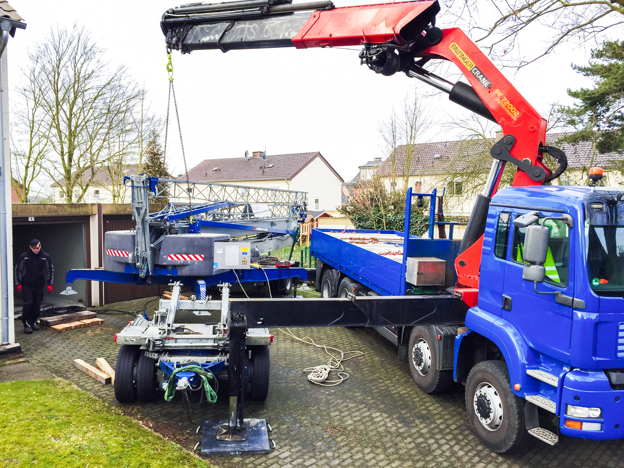 Das Aufstellen von Baukranen in engen Arbeitsbereichen stellt für uns kein Problem dar. Mit Hilfe unserer selbstfahrenden Schnellläufer-Achse bezwingen wir mühelos die letzten engen Meter. Kombinationen aus 2-achsig und 3-achsig sind wählbar.